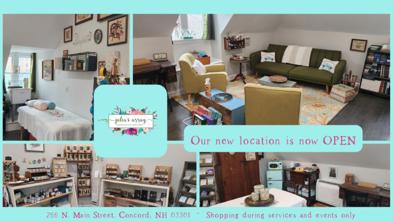 Julia Barton, the passionate owner of Julia’s Array Handcrafted Boutique and Olive & Bloom Holistic Care and Healing, located at 266 North Main Street, Unit #2, Concord, NH 03301, embraces the beauty of creativity and artistry.