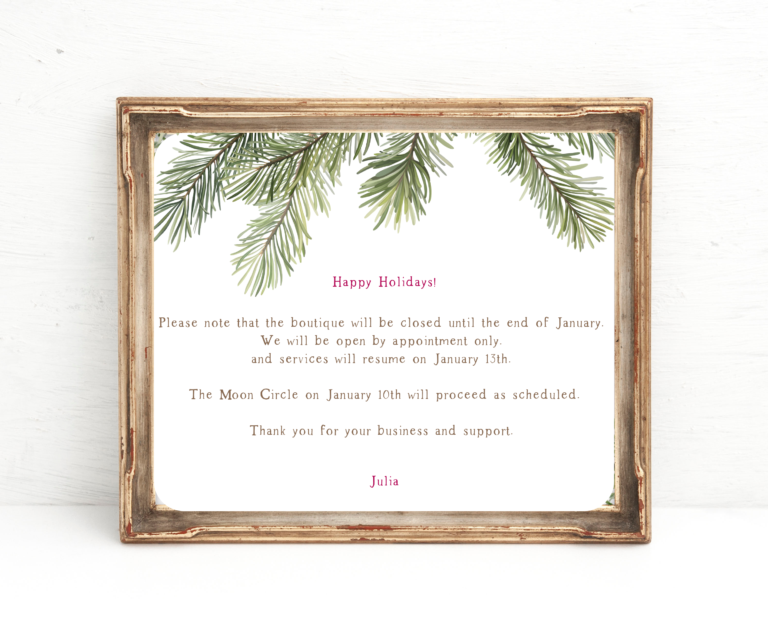 After stepping into the boutique, you’ll soon discover a tranquil wellness space where Julia offers her energy/intuitive sessions and an array of empowering classes, Reiki certifications, women’s circles, and much more.ย